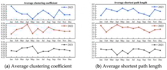 Figure 3), suggesting that the network structure tends to be more tightly clustered at this time. Also, the average shortest path length of the network shows an upward trend, which is consistent with the expansion of the network scale, indicating that the new nodes are more inclined to connect to highly clustered ports (such as large LNG exporting ports), and this change leads to a decrease in the transportation efficiency of the network. The fluctuations in the monthly data in 2022 and 2023 are significantly higher compared to 2021, especially in 2023, suggesting that the LNG shipping network has been affected by external events since 2022, the network structure has changed, and the volatility of the monthly network characteristics has increased, and this effect has continued until 2023. However, in terms of annual values, the changes in network topology characteristics are relatively steady between 2021 and 2023, which suggests that the LNG shipping network has a certain level of resistance to disturbances, that is, the network is more robust and can gradually recover to a stable state under external shocks. Nevertheless, the recovery process of the network structure is not immediate, so there are still significant fluctuations in the monthly characteristics in the short term. Taken together, the Russia–Ukraine conflict had a profound impact on the structure of the LNG shipping network, and the network still appears obvious fluctuations in a certain period, despite its strong robustness.