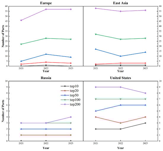 To investigate the difference in the key LNG trade regions before and after the Russia–Ukraine conflict, this paper focuses on the change in the importance of regional ports and the change in regional trade flows. The number of ports from Europe, East Asia, the USA, and Russia within the top 10, 50, 100, 200, and 300 are counted (