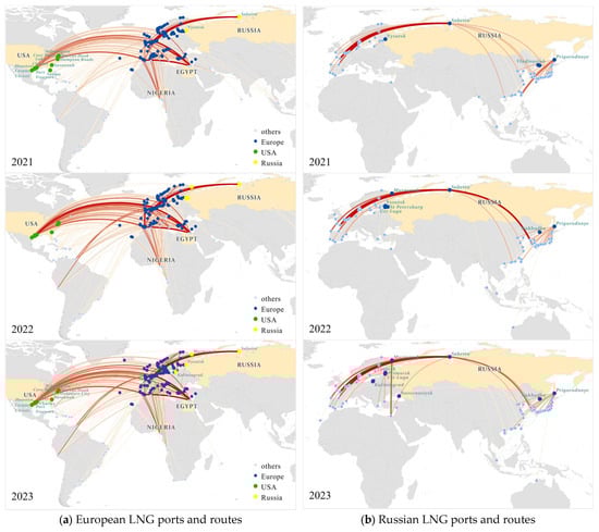 Figure 4). Of these, Europe and East Asia are the main LNG demand regions worldwide, and the USA and Russia are major LNG exporters and have been greatly affected by the Russia–Ukraine conflict, so these regions are considered in the analysis. Other main exporters such as Qatar, Australia, and Nigeria, where LNG trade is less affected by the Russia–Ukraine conflict and where the number of ports involved in LNG shipping is relatively stable, are excluded from the analysis in this section. Moreover, the routes linked to European and Russian ports are intercepted in this paper, where the nodes indicate the ports, the lines denote the presence of LNG transport between the ports, and the thickness of the lines shows the freight volume of the vessels passing through the routes, and the thicker the lines are, the larger the freight volume passing through the routes.
