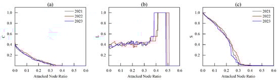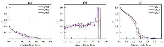 Figure 8, where the horizontal axis represents the attack node ratio, i.e., the ratio of the number of attacked nodes in the network to the number of nodes in the original network, and the vertical axis denotes the indicators of characteristics of the current network structure: the average clustering coefficient, the relative average shortest path length, and the relative size of the maximum connected subgraph, respectively. The black, red, and blue lines represent the LNG shipping network in 2021, 2022, and 2023, respectively.