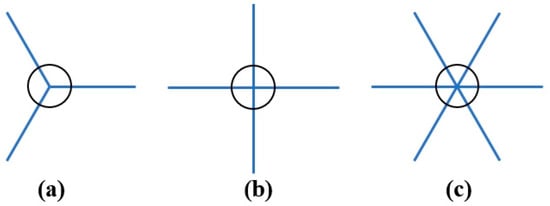 Mooring line patterns: (a) three-line pattern; (b) four-line pattern; (c) six-line pattern. (The black circles represent the wind turbines and the blue lines represent the mooring lines).