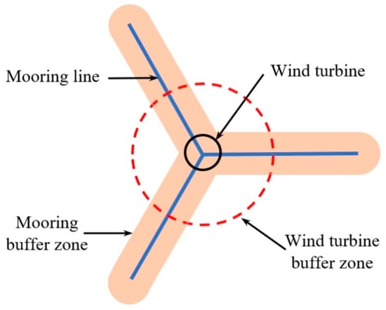 The mooring buffer zone is an area around each mooring line. In accordance with ISO 19901-7 [], a minimum separation distance of 100 m between offshore installations is prescribed. Consequently, a 50 m buffer radius around anchors and mooring lines, along with a 100 m safety distance between mooring systems, is considered appropriate [].