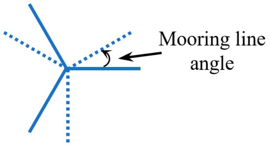 Generally, the number of mooring lines should be minimized to keep the most cost-effective design. However, if the required line size for a given number of mooring lines becomes prohibitively large, increasing the number of lines will be necessary. This study investigates three common mooring line patterns: the three-line pattern, the four-line pattern, and the six-line pattern, as demonstrated in Figure 2. For all mooring patterns, the lines are evenly spaced, leading to angles of 120°, 90°, and 60° between adjacent lines in the three-line pattern, the four-line pattern, and the six-line pattern, respectively.