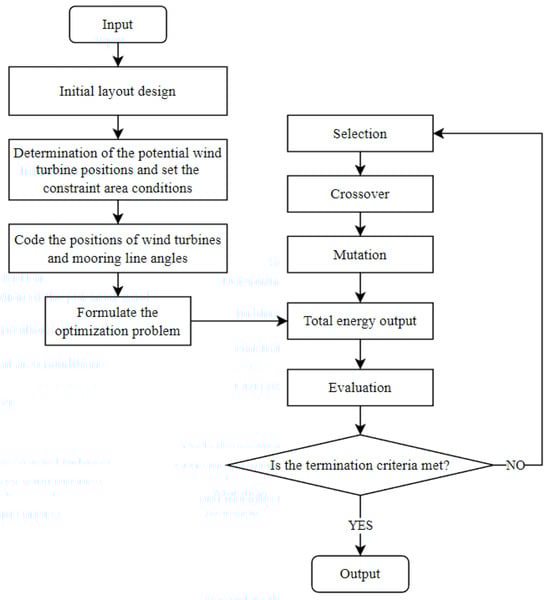 This study presents a novel method to solve the FOWF layout optimization problem. In the new method, both the positions of FOWTs and the mooring line angles can be optimized simultaneously. The objective is to find the strategy with the maximum power output. The optimization process is as follows, and a flowchart is shown in Figure 5.