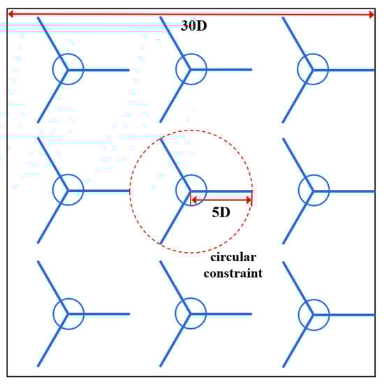 In this original strategy, a circular constraint is adopted, and the restricted radius is RMooring. A total of nine FOWTs can be installed with a spacing of 10D in each direction, so the rated power of this FOWF is 90 MW.