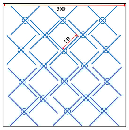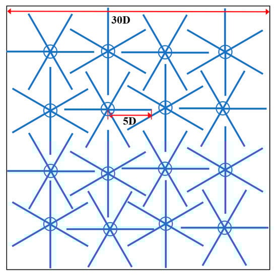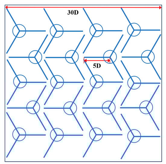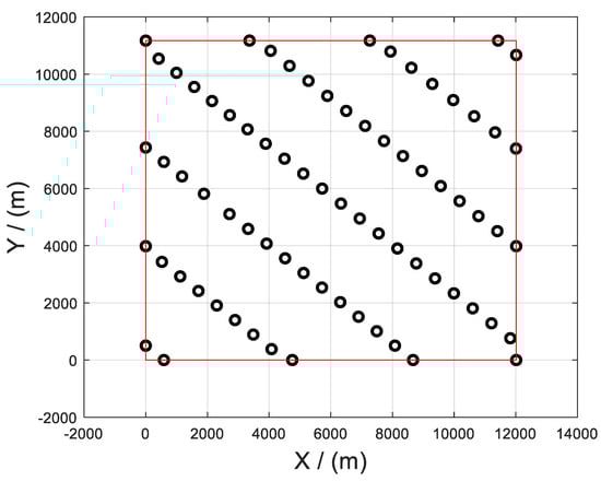 In this section, the proposed method is applied to optimize the mooring layout of the wind farm to further improve the efficiency. From the investigation of Section 3.3, the three-line pattern is relatively effective from the perspective of occupied area. Therefore, this study adopts the three-line pattern to optimize the layout of the wind farm. The number of wind turbines is 73; other parameters and the wind information are the same as the original wind farm. The minimum distance between FOWTs is set to be 6D, so the radius of the buffer zone Rw is 3D (774 m). The result of the optimized layout is demonstrated in Figure 13.