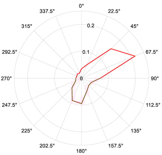 The wind speed information is obtained from the two meteorological stations nearest to the site. There are two main wind directions in the area where the wind farm is located, which are northeast and south. The wind shear profile is considered in this study, with the power law profile and an exponent of 0.0680. The annual average wind speed at the hub height is 8.15 m/s, and the turbulence is between 0.076 and 0.119. The wind direction rose measured at the height of 120 m is demonstrated in Figure 11.