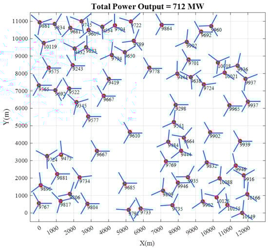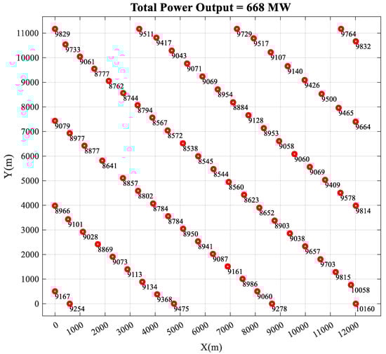To evaluate the effectiveness of each layout, the rated wind speed of 12.3 m/s at the hub height is set as the incoming wind speed in all case studies in this study. For the original wind farm, the power outputs of each wind turbine and the entire wind farm are demonstrated in Figure 12. The red points represent wind turbines, while the number beside the wind turbine is the average power output.