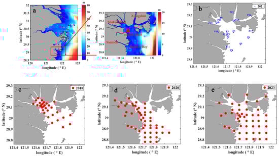(a) Water depth in SMB. (b) Hydrological stations in 2021 (P1–P11 are the temperature and salinity stations for 2021, and P12–P19 are the tidal level, velocity, and SPM time series change stations.); (c) Water quality stations in 2018; (d) Water quality stations in autumn 2019 and spring 2020; (e) Water quality stations in 2023.