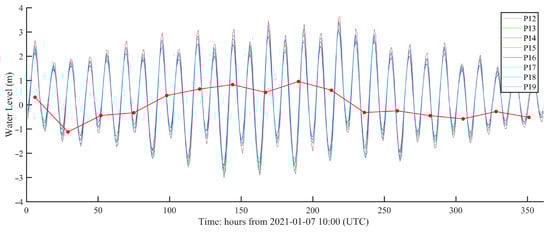 Tide level data were collected during the winter of 2021 (7–22 January), covering the entire spring–neap tidal cycle (Figure 2). The maximum tidal range exceeded 540 cm, with an incremental trend from the open sea to the bay’s shore, peaking at 644 cm in the bay. The average tidal ranges at all stations exceeded 340 cm. The maximum, minimum, and mean tidal ranges gradually enhance from the bay’s mouth to its head. The maximum tidal range was 533 cm at P17, 587 cm at P13, and 644 cm at P14. This propagation showed a 20.8% increase in the maximum tidal range from the bay’s entrance to its head. Both the highest/lowest and mean high/low tide levels exhibited a gradual increase pattern from the bay’s mouth to its head. Compared with P14 and P17, the highest tide level experienced a 20.3% increase. The minimum tidal range and average tidal range show similar spatial distributions.