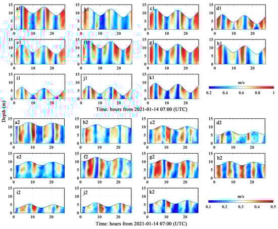 During spring tides (Figure 3(a1–k1)), the maximum current velocity (1.19 m/s) during flood tides exceeded that of ebb tides at almost all the stations (Figure 3(b1–h1)). The ebb currents ranged from 40% to 90% of their peak levels during the flood tides. The ebb currents were stronger than the flood currents in shallow water areas (Figure 3(a1,i1,j1,k1)). During neap tides (Figure 3(a2–k2)), the most intense tidal currents occurred near the surface level of P7 (Figure 3(g2)) during flood tides, reaching 1.2 m/s, closely followed by P1 (1.15 m/s, Figure 3(f2)).