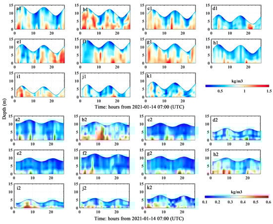 SPM profiles during spring tides ((a1–k1), representing stations P1–P11, respectively) and neap tides ((a2–k2), representing stations P1–P11, respectively).