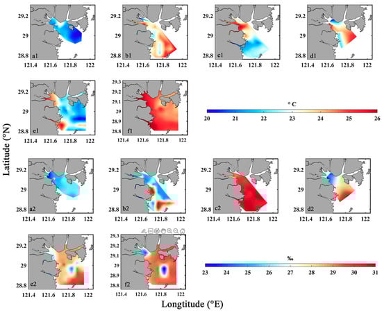 Sea surface temperature (a1–f1) and sea surface salinity (a2–f2). Spring 2018 (a1,a2); Autumn 2019 (b1,b2); Spring 2020 (c1,c2); Winter 2021 (d1,d2); Spring 2023 (e1,e2); Summer 2023 (f1,f2).