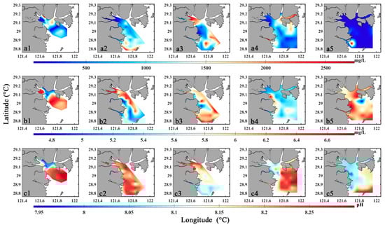 SPM concentration (a1–a5), dissolved oxygen concentration (b1–b5), and pH (c1–c5). Spring 2018 (a1,b1,c1); Autumn 2019 (a2,b2,c2); Spring 2020 (a3,b3,c3); Spring 2023 (a4,b4,c4); Summer 2023 (a5,b5,c5).