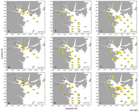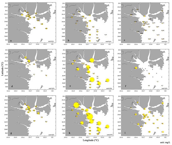 Surface organic carbon, sulfide and oil concentration: (a–c) are organic carbon, (d–f) are sulfides, and (g–i) are oils; (a,d,g) are measured data from 2018 (April, spring), (b,e,h) are measured data from 2019 (November, autumn), and (c,f,i) are measured data from 2023 (June, summer).