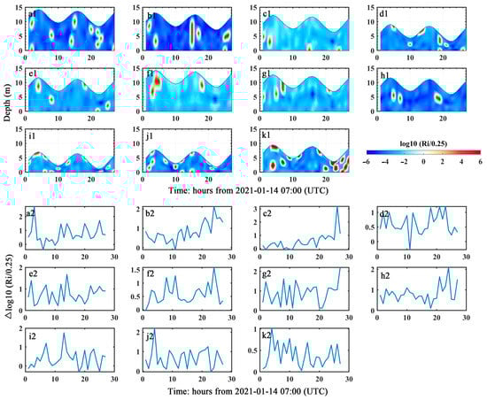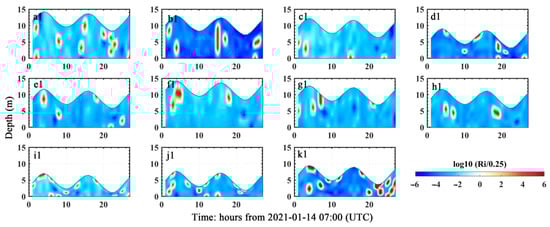 (a1–k1) During spring tides, total Richardson number log10(Ri/0.25) considering the salinity for calculating water density. (a1–k1) indicate the eleven stations P1–P11.