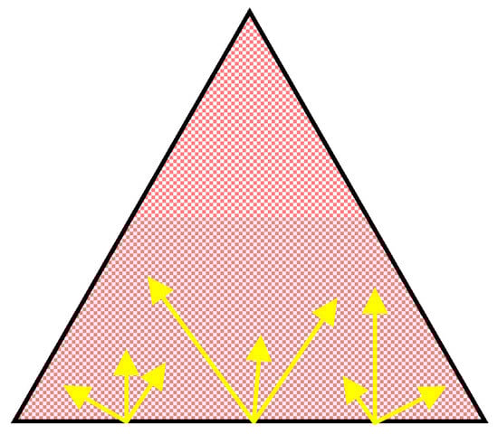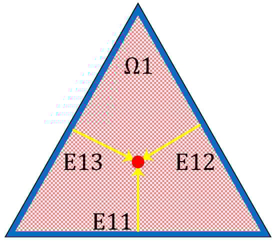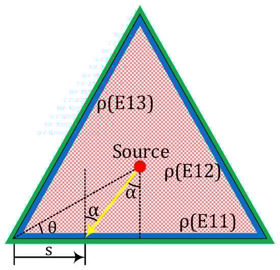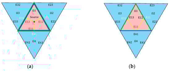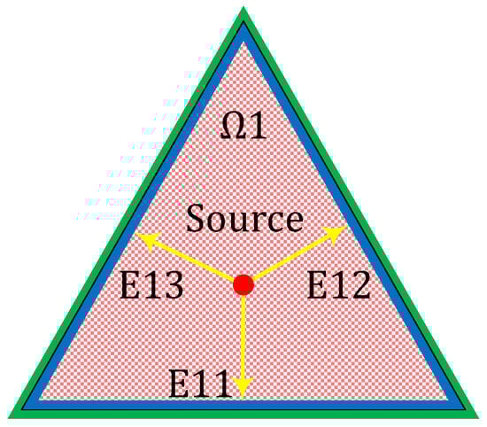 Here, is the initial source density projected onto the mesh boundaries that will be discussed in Section 2.2. represents the number of times boundary mapping occurs, and when , no boundary mapping occurs, which means that energy only exists in the internal boundary of the cell where the source point is located. When , one time boundary mapping occurs. The energy on one boundary is only transferred to the two adjacent half-boundaries, which correspond to the two adjacent edges of the triangle, as shown in Figure 3. Therefore, one time mapping can only be transferred to three half-boundaries, as shown as Figure 2.