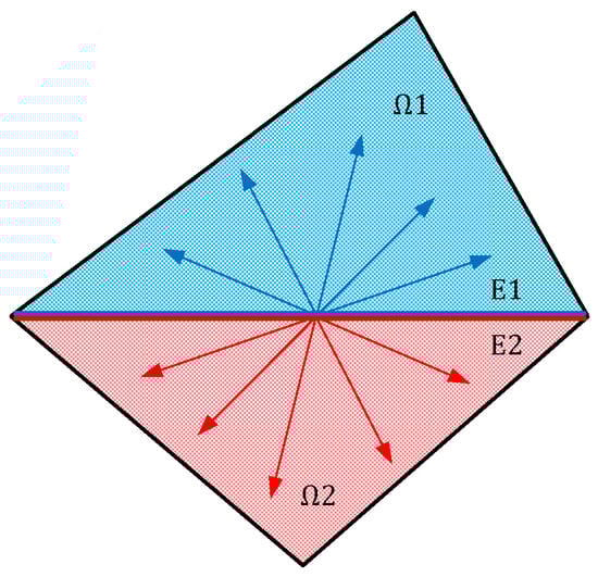 The element boundary is the smallest calculation element in this method, and energy mapping between the boundaries is the most critical step of this method. In this section, a two-dimensional triangular element is taken as an example to explain the whole process of boundary energy mapping in detail. According to the principle of the discrete element in the finite element method, complex structures are usually discretized into multiple triangular elements. Energy is transferred to adjacent elements through the boundary. Among them, adjacent elements usually share a boundary, and the boundary is divided into several half-boundaries, and each half-boundary corresponds to an element. The boundary contains all the rays that have reflected or refracted from this boundary. For a straight boundary, it includes the ray angle α ∈ [−π/2, π/2], and the ray energy transmitted to the inside of the element or other boundaries of the element in any direction. Among them, the ray angle α represents the angle between the ray and the boundary normal. When a boundary is adjacent to two elements, the boundary is divided into two half boundaries, as shown in Figure 3. For element Ω1, edge E1 is the inner boundary and E2 is the outer boundary; for element Ω2, edge E2 is the inner boundary and E1 is the outer boundary.