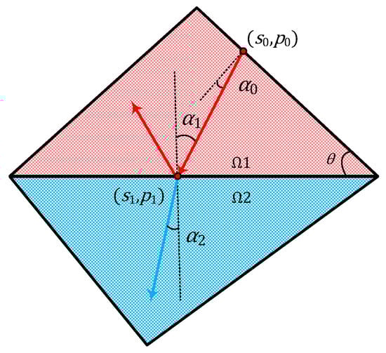 The coordinate mapping relationship between boundaries is explained in detail below. Figure 4 shows two adjacent triangular elements, where the positive direction of all boundary line coordinates is counterclockwise, as shown by the pointing arrow in Figure 5. A ray on the boundary 1 in element 1 that starts at (s0, p0) propagates on boundary 2 of the element at an angle α0; the incident angle is α1, and intersects at (s1, p1). The rays then form reflections and refractions at (s1, p1). At this time, boundary 2 is adjacent to the two elements, so it is divided into two half boundaries, one of which contains the energy reflected back to element 1, while the other half of the boundary contains the energy refracted into element 2.