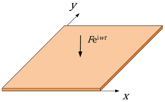 After completing the theoretical work, we use the examples in the literature [42] as simulation objects to explore the usability of our method. As shown in Figure 10: The calculation model is a square plate of 1 m × 1 m with simple supports around it. The excitation load acts on the center of the plate with a value of F = 0.01 N, the thickness is 0.001 m, the Young’s modulus E = 7.1 × 1010 N/m2, and the density ρ = 2700 kg/m3.