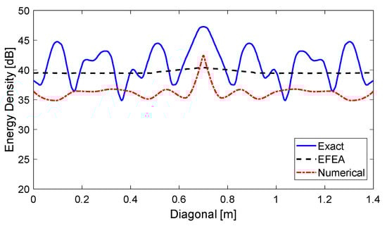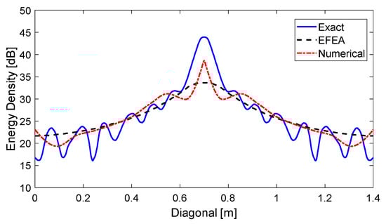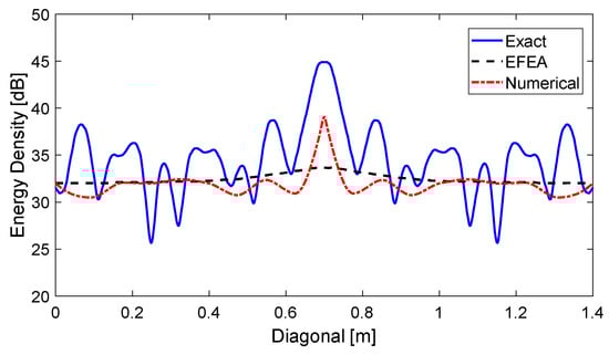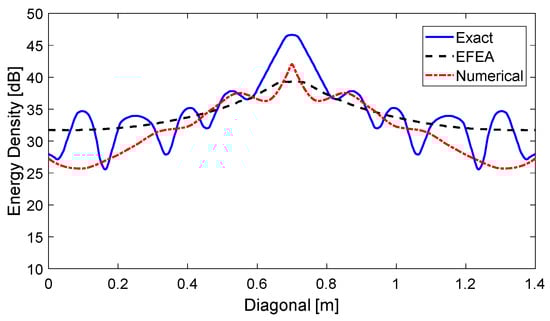 The energy distribution along the diagonal of the plate. Here, the frequency f = 487 Hz and the damping η = 0.20. Exact (blue line) represents the solution given by the literature [42], EFEA (black line) represents the predicted value obtained from the energy finite element analysis, and Numerical (red line) represents the predicted value of the method proposed in this article. The reference value of energy density is 1 × 10−12 J/m2.
