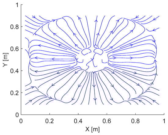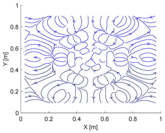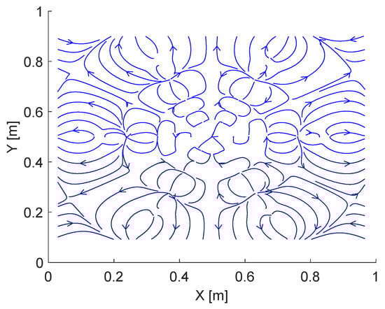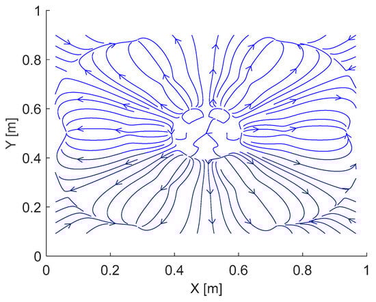 The energy flow map of the energy distribution predicted by the method proposed in this article. Here, the frequency f = 487 Hz, and the damping η = 0.05. The reference value of energy flow is 1 × 10−12 W/m2.