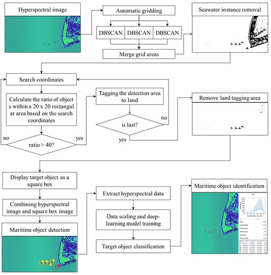 The proposed maritime object identification method emphasizes field applicability and effectiveness. The process involves three main steps: pre-screening detection of maritime objects, selection of desired areas, and confirmation of the identification results (Figure 2). Pre-screening involves the removal of seawater and land by comparing the hyperspectral data with the original images. This process highlights detected maritime objects (single pixels) in red, making them easily distinguishable in the hyperspectral images. Undetected objects, however, are not marked. Analysts can address this limitation by manually selecting suspected areas using a drag-and-drop interface. The selected area’s spectral statistics and image data are then extracted, processed by the analysis model, and returned with identification information.