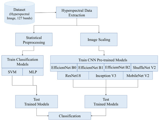 Proposed workflow for hyperspectral data processing and classification using machine learning.