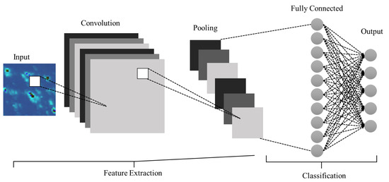 This study applied CNN models to identify maritime objects using hyperspectral data. CNNs are a type of artificial neural network that employ convolutional operations to extract meaningful features from input images [52,53]. The convolutional layer analyzes the local characteristics of input images, while convolutional filters and weight sharing reduce the number of trainable parameters, enhancing computational efficiency. Additionally, CNNs include max-pooling layers to decrease the dimensionality of input images and fully connected layers for classification into different classes (Figure 4).