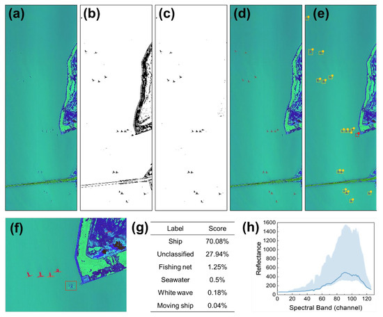 Maritime object detection and identification using a hyperspectral image taken in Mokpo. (a) Hyperspectral RGB image. (b) Image after seawater removal. (c) Image after land removal. (d) Resulting image used for maritime object detection. (e) Image showing detected and undetected objects. (f) Enlarged image of undetected object. (g) Maritime object identification scores. (h) Spectral characteristics of undetected area.