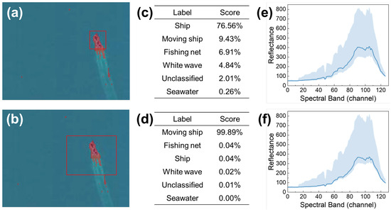 Identification of a moving ship. (a) Selected area on the ship (red box). (b) Selected area including the white wave near the ship (red box). (c,d) Identification scores for areas marked in (a) and (b). (e,f) Spectral characteristics of areas marked in (a) and (b).