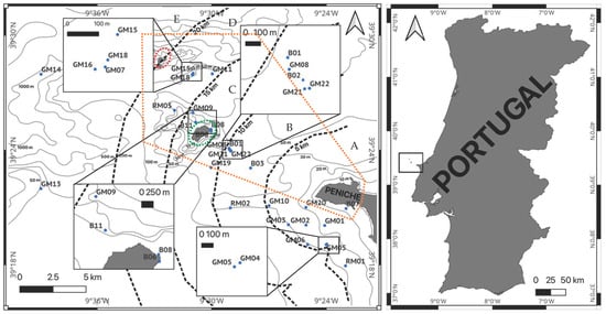 Geographical location of eDNA samples (blue dots) collected by fishermen (RM—Rio-Minho, GM—Guerreiro-do-Mar) and by the research team (B). The black dotted lines represent the distance from the coastline to which the sample belongs (5 km—map region A, 10 km—map region B, 15 km—map region C (includes the large Berlenga Island), 20 km—map region D and >20 km—map region E). The continuous grey line represents depth in metres (m). The orange dotted line represents the area of UNESCO Biosphere Reserve of the Berlengas archipelago. The green dotted circle represents the large Berlenga Island in region C. The red dotted circle represents Farilhões Island. Samples B00, B04, B05, B09, B10 and B11 were collected at the same geographical location.