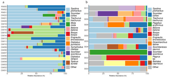Focusing on the twelve most abundant species (Figure 2a,b), RT samples generally presented a greater number of species compared to FC samples, which were clearly dominated by the species caught by fishermen during sampling, such as European pilchard, Atlantic horse mackerel Trachurus trachurus (Linnaeus 1758) and Atlantic chub mackerel Scomber colias (Gmelin 1789) (Figure 2a, Table 1). Despite the general agreement between the dominance of these three fish species (Figure 2a) and the species caught by fishermen (Table 1), there were some samples where this tendency was not observed, such as GM05, GM09, GM11, GM13 and GM18.