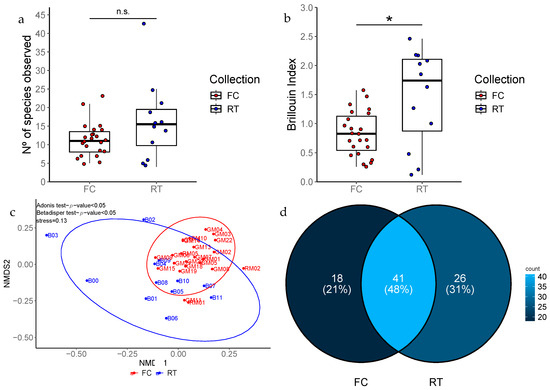 Fish species diversity regarding sample sources FC and RT. (a,b) The alpha-diversity index for number of species detected and alpha-diversity index Brillouin, respectively, for FC samples (red box and points) and RT samples (blue box and points). (c) The beta-diversity Jaccard index. (d) Venn diagram. Welch statistical analysis (a,b) and Adonis, pairwiseAdonis and Betadisper test (c). *—statistically significant; n.s.—not significant.