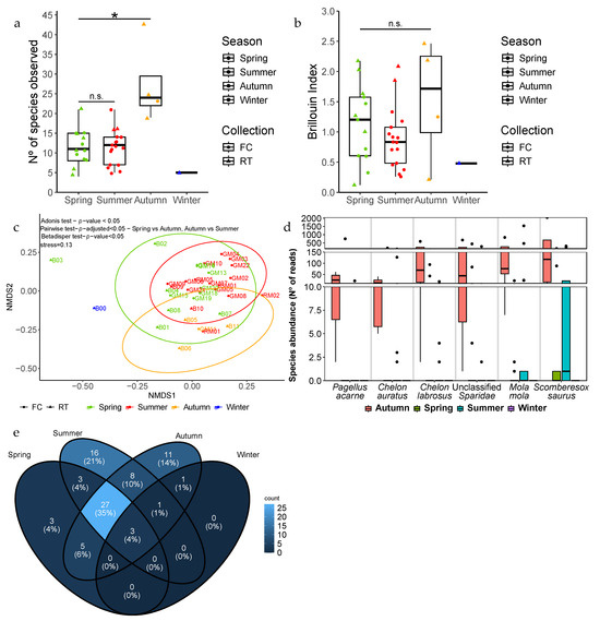 Fish species diversity regarding seasons. (a,b) The alpha-diversity index for number of species detected and alpha-diversity index Brillouin, respectively, for spring (green), summer (red), autumn (yellow) and winter (blue). (c) The beta-diversity Jaccard index. (d) The species responsible for the dissimilarity observed on the Jaccard index. (e) A Venn diagram with the overlapping species among seasons. Tukey test (a,b) and Adonis, pairwiseAdonis and Betadisper test (c). *—statistically significant; n.s.—not significant. Dots represent FC samples, triangles represent RT samples (a–c).