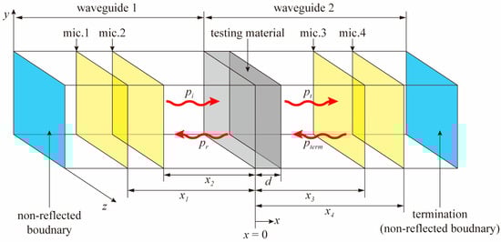 A plane wave propagating in a waveguide is divided into an incident wave (), a reflected wave in waveguide 1 (), a transmitted wave (), and a reflected wave in waveguide 2 (pterm) due to reflection and transmission at the testing material and the termination of the waveguide. The , , and are measured by acoustic microphones attached to the waveguide. It is assumed that the acoustic wave propagating in the waveguide has the form of a harmonic function; the acoustic pressure measured by the n-th microphone is expressed as: