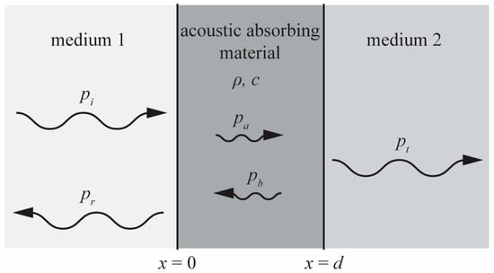 where and are the acoustic pressure and particle velocity at and , respectively, and is the transfer matrix of the acoustic absorbing material. As shown in Figure 2, is forward wave and is backward wave in the acoustic absorbing material. The acoustic pressure and particle velocity at each interface are expressed as follows: