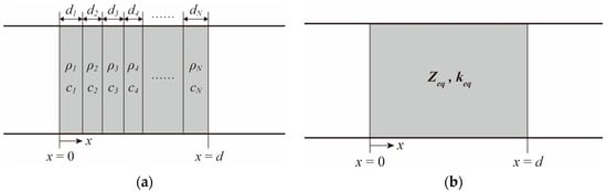 Acoustic absorbing material of (a) multi-layer structure, (b) single layer with equivalent properties.