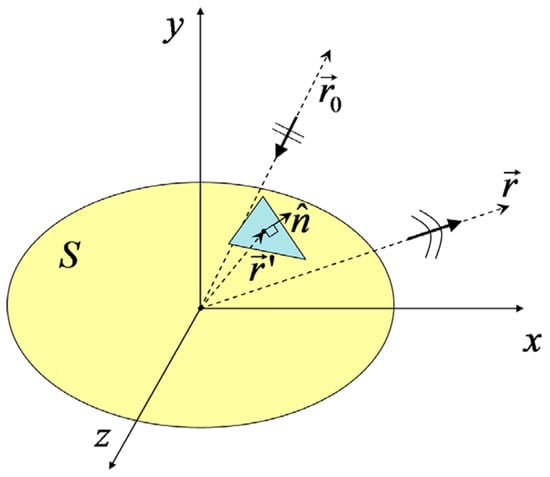 In this study, the PO/GO combined method [], which has been effectively and frequently used for TS analysis, was adopted to propose the simplified analysis procedure of an underwater vehicle considering the TSAMs. In this section, the frequency-domain-based physical optics theory used in this method is explained. The theory is derived from the Kirchhoff–Helmholtz integral equation by applying the Kirchhoff approximation theory.