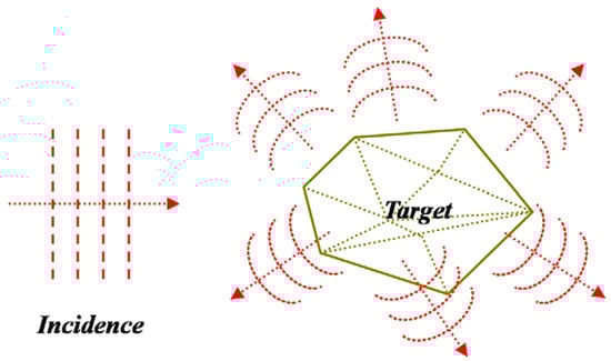The pressure at the arbitrary location scattered from the target in the frequency domain is derived from the Kirchhoff–Helmholtz integral equation, which is described in Equation (25), assuming that the acoustic wave is incident toward the center of the target in the form of a plane wave, as shown in Figure 4.