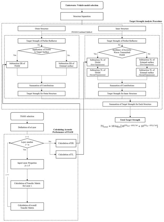 In this study, a simplified TS analysis procedure is suggested, which evaluates the TS of underwater vehicles by considering the acoustic performance of TSAMs. The suggested overall TS analysis procedure is illustrated in Figure 6.