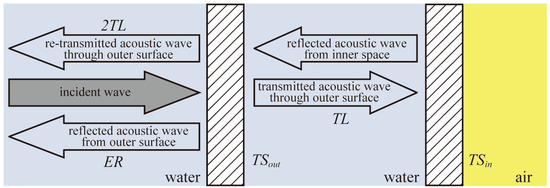For the inner structure, acoustic waves are first transmitted through the outer structure and then incident on the inner structure. The waves reflected by the inner structure are then transmitted back through the outer structure before radiating into the underwater, as shown in Figure 7. This process involves double transmission, leading to the loss of acoustic energy. Therefore, the TS of the inner structure is calculated by considering both the TS derived under the assumption of perfect reflector and two times of transmission loss due to TSAM.