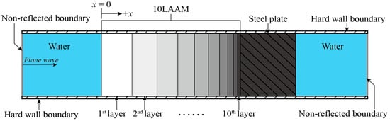 Density, Young’s modulus, Poisson’s ratio, loss factor and thickness of the steel plate are set to 7850 kg/m3, 200 GPa, 0.3, 0.001, and 20 mm, respectively. Both sides of the structure including 10LAAM and steel plate are assumed to be contacted with water, which is fresh water without salinity, the density and sound speed of which are 1000 kg/m3 and 1500 m/s, respectively.
