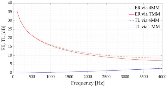 From the results, it is observed that discrepancies between both results become larger as frequency rises, and this is because TMM has some limitations in its application due to the relationship between the thickness of TSAM and incident wavelength. Nevertheless, ER and TL evaluation results via both methods show good agreements and similar tendencies to each other with maximum differences of 1.43 dB and 0.13 dB at 4 kHz on ER and TL, respectively. Meanwhile, computation times of the methods are represented in Table 2, and it is concluded that TMM is more suitable for the proposed simplified TS analysis procedure than 4MM because of the relatively low calculation and time costs required on the acoustic performance evaluation of TSAM.