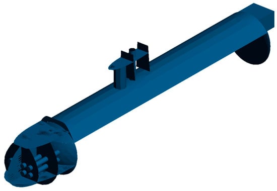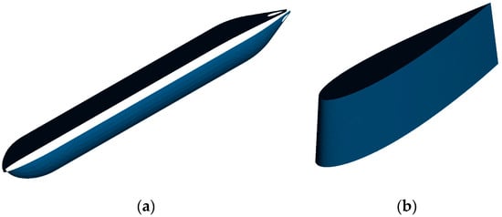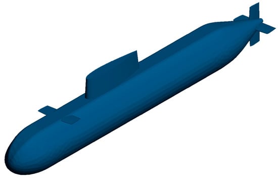 The BeTSSi model simulates the geometric and acoustic characteristics of a 1700-ton former Soviet diesel submarine (Kilo class). This model is selected for its comprehensive representation of both the outer and inner structures of an underwater vehicle including its outer hull, pressure hull, sail, mast, functional sonar, bulkheads, torpedo tubes, and so forth. These features ensure the model sufficiently captures the geometric and acoustic complexities of realistic underwater vehicle designs. The BeTSSi model was proposed for verification of the performance of TS simulation software used by NATO countries and is widely utilized as a standard model for various TS analyses and reduction designs []. Future work could consider incorporating more complex geometric structures to reflect the design features of next-generation submarines. The outer structure whose length, breadth, and depth including the sail of the model are 62 m, 7 m, and 11 m, respectively, is shown in Figure 11 and the inner structure is shown in Figure 12.