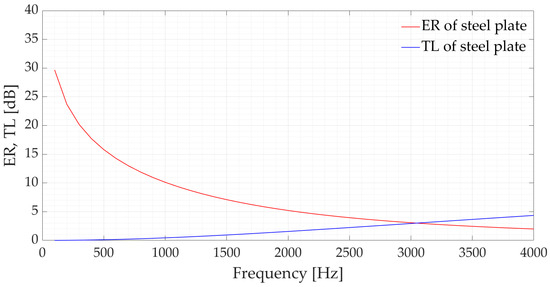 From the results shown in Figure 17, it is observed that the overall TS evaluation results of the outer structure for the cases of “Steel plate” and “Steel plate + 10LAAM” are 3.1 dB and 3.4 dB lower than that for “Perfect reflector”. It seems that partially attached 10LAAM contributed to the outer structure having slightly higher ER performance in the “Steel plate + 10LAAM” case compared to “Steel plate” case, since the ERs of steel plate itself and 10LAAM with steel back plate are 3.1 dB and 4.0 dB at 3 kHz, as shown in Figure 13 and Figure 10, respectively. In addition, from the results shown in Figure 18, the TSs of the inner structure for the “Steel plate” and “Steel plate + 10LAAM” cases were 5.9 dB and 13.3 dB lower than those of the “Perfect reflector” case. It is confirmed that the TL characteristics of them are doubled compared to the TLs of steel plate itself and 10LAAM with steel back plate, which are given as 2.9 dB and 6.6 dB at 3 kHz in Figure 13 and Figure 10, respectively. This is because the acoustic waves incident to the inner structure is considered to transmit to the outer structure twice.