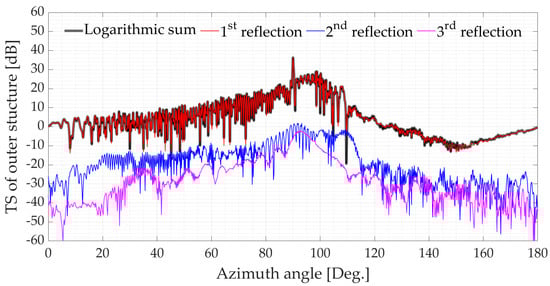 From the results shown in Figure 15, it is confirmed that the first reflection component dominantly contributes to the TS of the outer structure at all azimuth angles against the other components. On the other hand, for the inner structure, it is observed that the first reflection component is dominant near incidence azimuth angles 0°, 90°, and 180°, which are facing the bow, midship, and stern sections, respectively, as shown in Figure 16. At the other azimuth angles, the second reflection component is relatively dominant because of the multi-reflection effects due to transverse bulkheads and torpedo tubes.