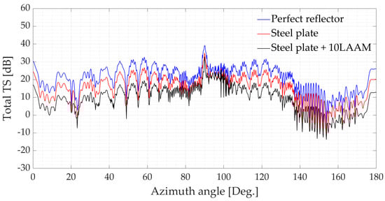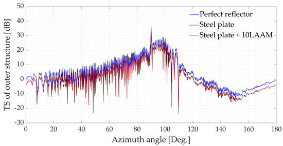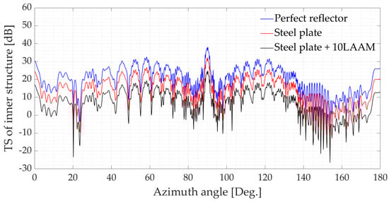Meanwhile, it is highly complicated to calculate multiple reflection effects of the inner structure when TS reduction methods are applied to only a part of the structure. Thus, most acoustic waves incident to the inner structure at elevation angle 0° are assumed to be transmitted through the outer structure that has 10LAAM on its surface; the TL characteristic of 10LAAM with a steel back plate shown in Figure 10 are uniformly considered in relation to the outer structure in TS analysis for the inner structure. Additionally, since it is difficult to seek information on the material properties of the inner structure, the inner structure of the model is retained to be perfect a reflector in the second and the third analysis cases.