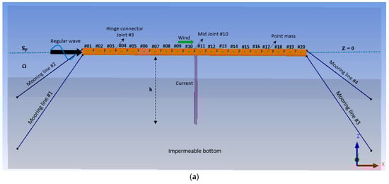 The dynamics of the multi-module floating structures were studied using the theory of potential flow and the Euler–Bernoulli beam assumption [10]. The floating airport’s nonlinear dynamics, composed of several multi-modules connected with flexible connectors and mooring systems, were examined [11]. Subjected to regular waves, the impact of hinged connectors of two-dimensional floating plates (modelled as Mindlin plate theory) was studied over finite water depth [12]. The bending moment and structural deflection of the floating plate structures subjected to regular waves were analysed [13]. Under external loads, the transient response of an interconnected flexible structure was simulated based on a time domain method [14]. Boundary Integral Equation Method (BIEM) codes were developed to analyse the influence of the stiffness of mooring lines on the structural behaviour of a floating flexible plate in different water depths [15] and circular structures [16]. ANSYS AQWA was implemented to determine the RAOs and analyse the effect of winds on an integrated offshore fish cage and wind turbine [17]. The hydroelastic behaviour of the VLFS with porous, non-porous, or two submerged horizontal plates was analysed based on a numerical model [18]. The BEM was implemented to study the hydroelastic response of a VLFS edged with two inclined porous plates under oblique waves, and the results were validated against model tests [19]. The performance of the FC connector of a large modularized floating structure was studied based on the network modelling method and finite element method (FEM) [20].