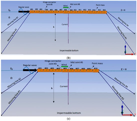 (a) Numerical setup of interconnected floating structure (20 bodies; #01,#02, …, #20) with current and wind loads. (b) Numerical model of 16 hinged plates (#01, #02,…, #16) with current and wind conditions. (c) Numerical model of 10 hinged plates (#01, #02,…, #10) with current and wind conditions.